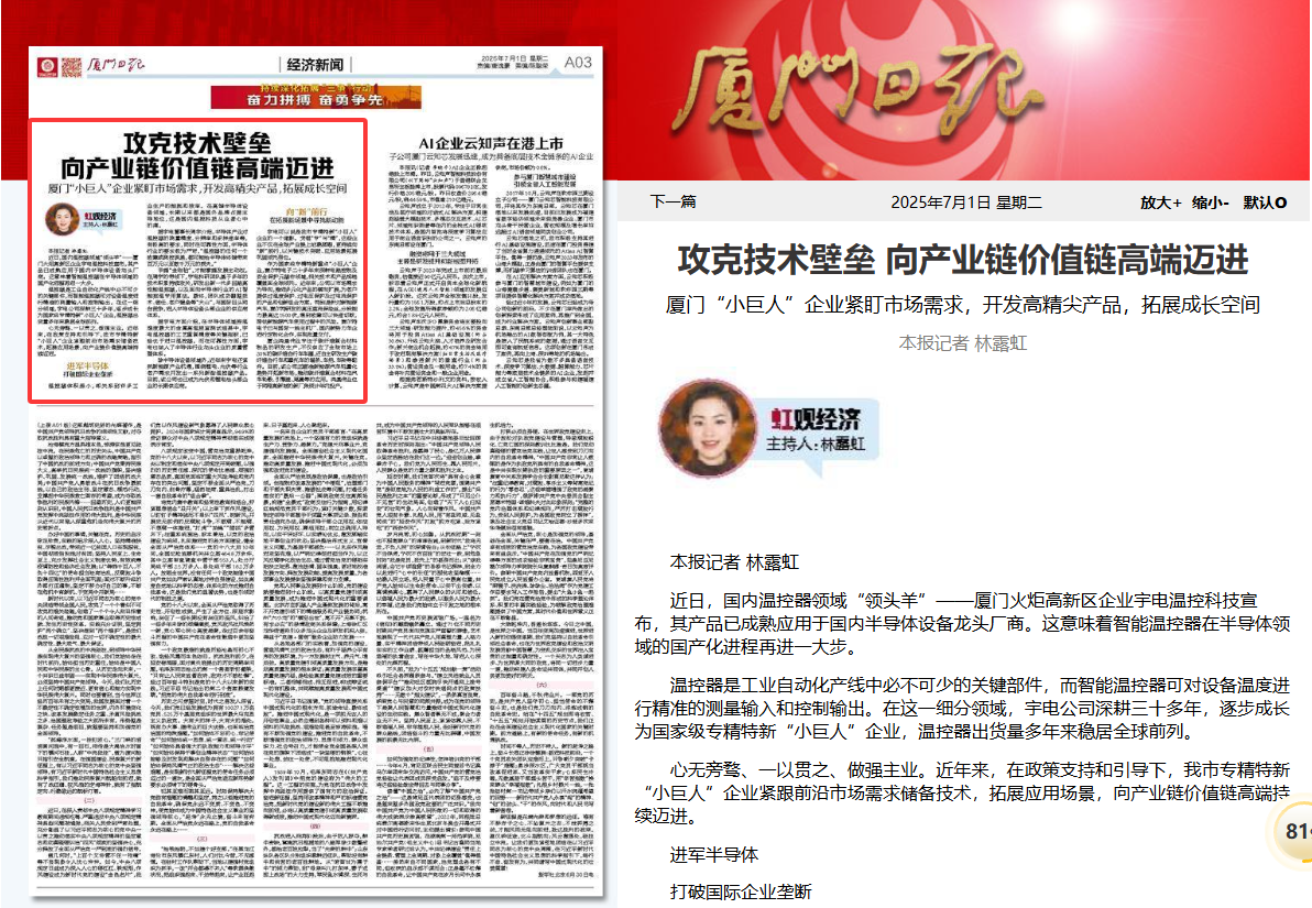 7月1日,《廈門(mén)日?qǐng)?bào)》在報(bào)道宇電新突破的頭條報(bào)道中提到,國(guó)內(nèi)溫控領(lǐng)域“領(lǐng)頭羊”宇電的產(chǎn)品已成熟應(yīng)用于國(guó)內(nèi)半導(dǎo)體設(shè)備龍頭廠(chǎng)商。這意味著智能溫控器在半導(dǎo)體領(lǐng)域的國(guó)產(chǎn)化進(jìn)程再進(jìn)一大步。以下是發(fā)表全文和版面:攻克技術(shù)壁壘 向產(chǎn)業(yè)鏈價(jià)值鏈高端邁進(jìn)廈門(mén)“小巨人”企業(yè)緊盯市場(chǎng)需求,開(kāi)發(fā)高精尖產(chǎn)品,拓展成長(zhǎng)空間本報(bào)記者 林露虹  近日,國(guó)內(nèi)溫控器領(lǐng)域“領(lǐng)頭羊”——廈門(mén)火炬高新區(qū)企業(yè)宇電溫控科技宣布,其產(chǎn)品已成熟應(yīng)用于國(guó)內(nèi)半導(dǎo)體設(shè)備龍頭廠(chǎng)商。這意味著智能溫控器在半導(dǎo)體領(lǐng)域的國(guó)產(chǎn)化進(jìn)程再進(jìn)一大步?! 乜仄魇枪I(yè)自動(dòng)化產(chǎn)線(xiàn)中必不可少的關(guān)鍵部件,而智能溫控器可對(duì)設(shè)備溫度進(jìn)行精準(zhǔn)的測(cè)量輸入和控制輸出。在這一細(xì)分領(lǐng)域,宇電公司深耕三十多年,逐步成長(zhǎng)為國(guó)家級(jí)專(zhuān)精特新“小巨人”企業(yè),溫控器出貨量多年來(lái)穩(wěn)居全球前列?! ⌒臒o(wú)旁騖、一以貫之、做強(qiáng)主業(yè)。近年來(lái),在政策支持和引導(dǎo)下,我市專(zhuān)精特新“小巨人”企業(yè)緊跟前沿市場(chǎng)需求儲(chǔ)