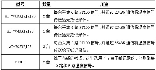 本監(jiān)控方案由PT100熱電阻溫度傳感器和AI儀表(溫度巡檢儀)以及無(wú)紙記錄儀組成。系統(tǒng)配置清單如下: