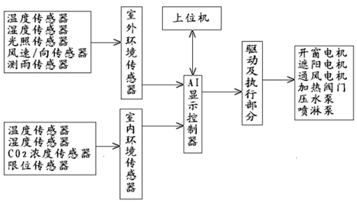 AI總線系統對蔬菜大棚作物生長的主要環境參數如溫度、濕度、光照、通風進行測控,實現在線閉環調節。實現對蔬菜的生長環境、技術管理、生產管理優化的科學決策。系統結構如圖1所示。