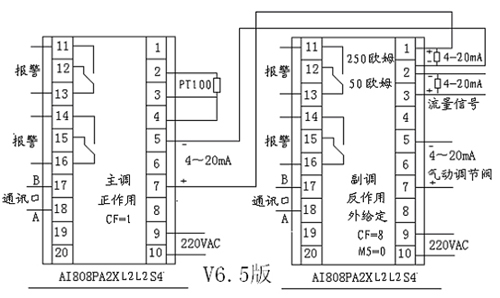正確接線(圖二),注意信號方向,設置參數:副調:AI-808AXL2、流量量程標度1.60T/h、設定值0.80T/h(系統正常運行時的流量值)。dF=2、Ctrl=1、Ct1=1、Sn=32、dIP=2、dIL=0、dIH=1.60T/h、OPI=4、CF=8(反作用、外給定功能)、dL=2、可設置正、負偏差報警。主調:AI-808AXL2、傳感器熱電阻,設定值40℃、Ctrl=1,dF=0.2、Ct1=4、Sn=21、dIP=1、OPI=4、CF=1(正作用)、dL=2、可設置上、下限報警、正、負偏差報警。(圖二)