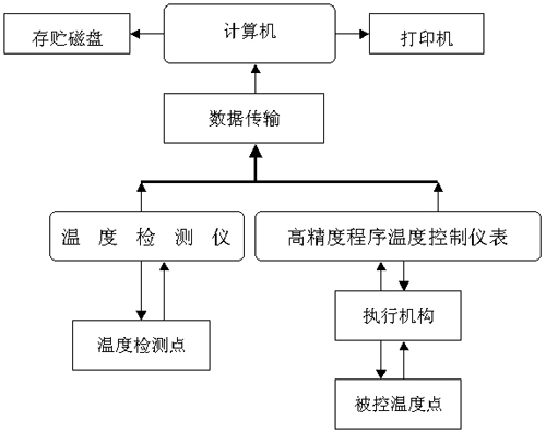 為達(dá)到上述生產(chǎn)工藝要求,系統(tǒng)采用各控制點(diǎn)分別采用單點(diǎn)高精度控制器進(jìn)行單獨(dú)控制,各參數(shù)點(diǎn)分別采用單獨(dú)的數(shù)據(jù)采集設(shè)備進(jìn)行單獨(dú)采集,將所有數(shù)據(jù)傳送至中心計(jì)算機(jī)進(jìn)行集中顯示、分析和處理。系統(tǒng)結(jié)構(gòu)如圖所示: