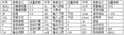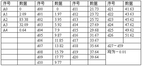 輸入:PTI00鉑電阻顯示二位小數(shù),采用自定義輸入規(guī)格Sn=10根據(jù)法執(zhí): 計(jì)算A01=1×1+0×8+1×16+3×64=209,A02=8333 A03=3209 A04=6418 d00 d01等參數(shù),采用表格輸出值就是顯示值如下:將表格內(nèi)參數(shù)輸入儀表。
