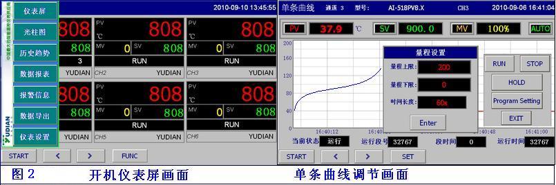 1、數據采集及控制:軟件系統從工業現場溫度控制器采集測量值,編輯實時曲線,可同時顯示8條實時曲線,用顏色來區別。曲線顯示可選百分比與實時曲線2種圖。也可屏蔽其他曲線,顯示單條曲線。呈現的實時數據,并存入系統內數據庫,以便日后數據查詢等使用。在流程圖、實時趨勢圖或儀表畫面上: