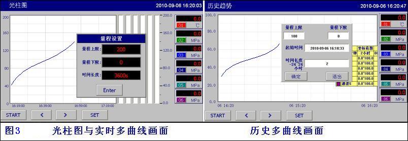 實時、歷史組合多趨勢曲線在【實時曲線】【歷史曲線】按通道順序排列1、2、3、4、6固定組合在一起,直觀的顯示相關通道間的變化關系。點擊【數據框】返回【實時畫面】通道。在【歷史曲線】畫面點擊【S】可選擇啟用單條或4條曲線,顯示趨勢變化;設置查詢起始時間及時間跨度;不同的數據量程范圍啟用單條查詢。通過【上一頁】,【下一頁】的切換組合通道。
